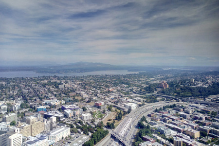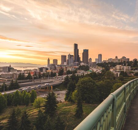 Seattle skylines and Interstate freeways converge with Elliott Bay and the waterfront background of in sunset time, Seattle, Washington State, USA..