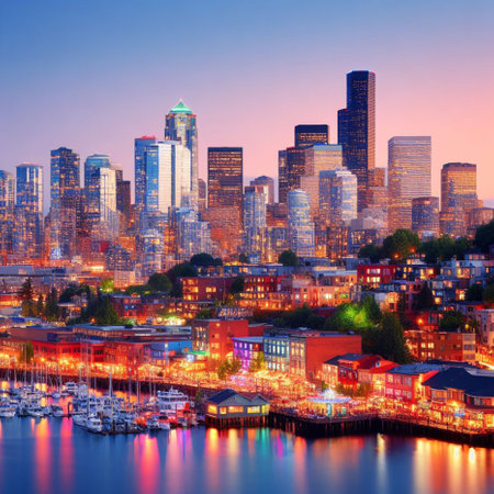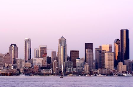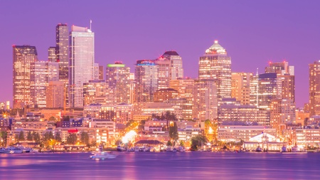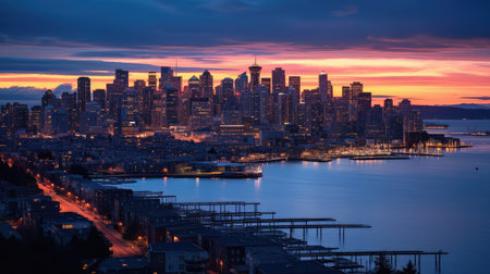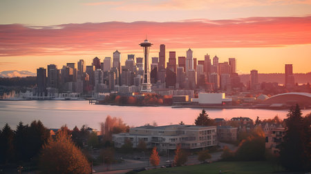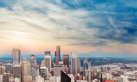 Seattle skyline at sunset with urban skyscrapers and urban architecture.