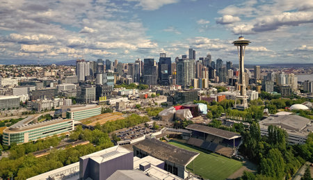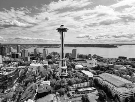 Seattle, Washington, USA- July 25, 2024: Architecture of aerial Space needle. Aerial view of Seattle with Space Needle tower. Panoramic view. Seattle downtown skyline. Aerial Seattle. Space Needle. Modern Seattle district, USA.