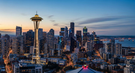 An aerial view of the cityscape of Seattle during sunset, the Space Needle