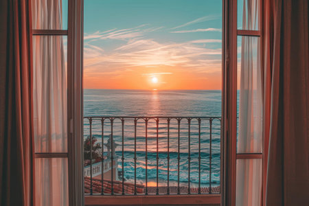 An open window frames a beautiful sunset over a tranquil sea. The scene features soft lighting, with shades of blue and pink. The composition highlights the water, sky, and land. This serene image could be suitable for various commercial or editorial applications.