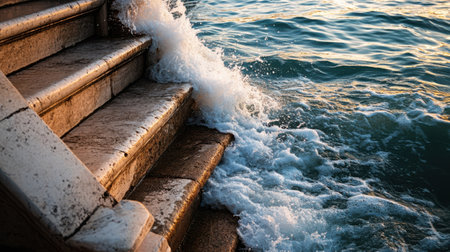An Ocean waves crashing against steps at sunset