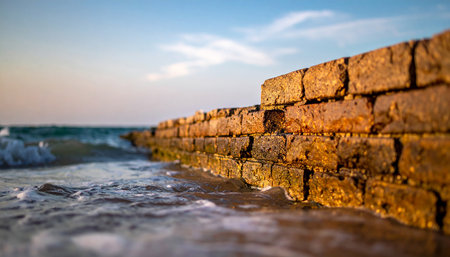 A weathered brick seawall is partially submerged by gentle ocean waves at sunset.