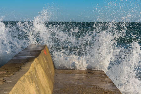 Dike and ocean waves with white foam. Digue de Sainte-Barbe in Saint Jean de Luz, France. The waters of the Bay of Biscay. Splashing sea water. Engineering structure for protection against sea waves