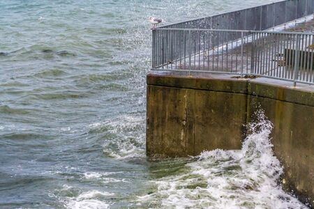 A seagull sits on a seawall in West Seattle, Washington as waves rollin.