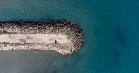 Top view of a breakwater with large boulders jutting into the sea. Surrounded by a calm sea. Ideal for backgrounds or travel concepts. Space for text