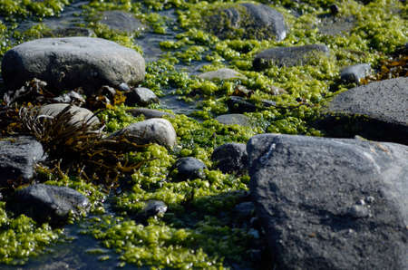 Stones with green algae on the seashore. Nature.
