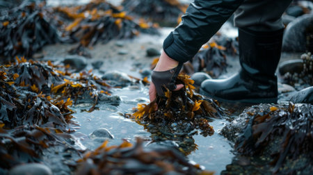 A person delicately picks their way through rocks and tide pools carefully collecting tender seaweed and sea gs