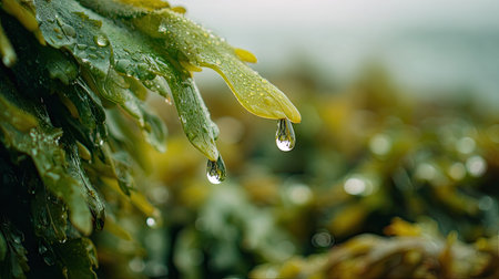 Soft rain falling gently on Sea lettuce, with water droplets forming and slowly dripping. The background is softly blurred with a natural, moody atmosphere.