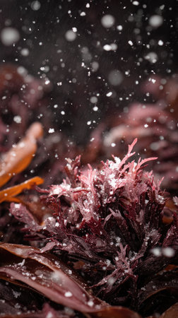 First snow falling gently on Red algae, a few snowflakes drifting slowly and settling on the leaves; fresh air, natural.