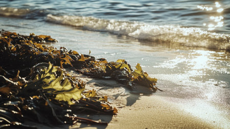 Fresh green seaweed sprawls across a sandy beach, kissed by gentle waves and warm sunlight, showcasing the beauty of nature and marine life.