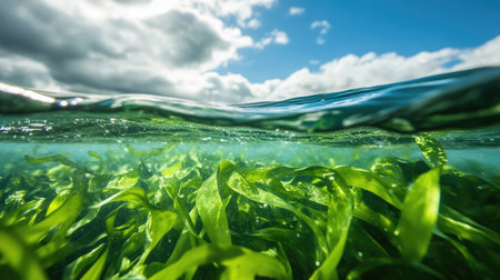 Lush green seaweed sways gently beneath the surface of tranquil turquoise water, showcasing the stunning ecosystem of a coastal environment on a sunny day.