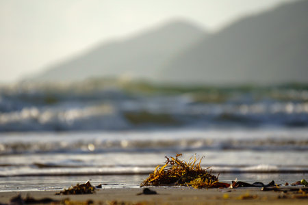 Seaweed on the seashore at sunset, close-up