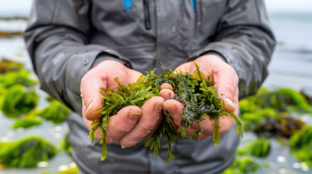 A person holds a handful of fresh seaweed at the shore, showcasing vibrant green aquatic plants against a backdrop of the ocean and beach.