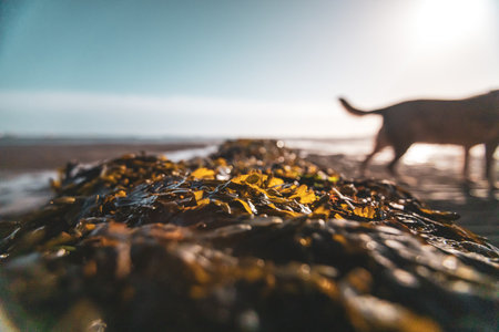 A selective focus shot of Seaweed and a dog on the beach. Weymouth, Dorset