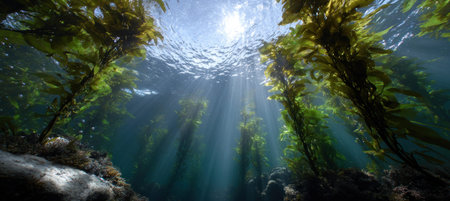 A vibrant underwater scene showcasing a kelp forest, with sunlight creating a beautiful effect.