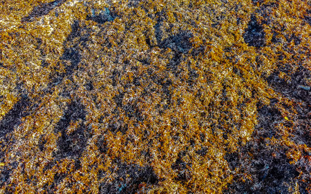 Fresh yellow orange sea weed sea grass sargassum or sargazo on beach sand at tropical Mexican Caribbean sea in Playa del Carmen Mexico.