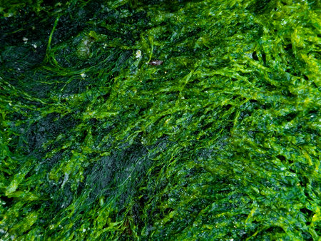beautiful sea shore covered in vibrant green algae in autumn sunlight