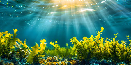 Dive into a breathtaking underwater scene showcasing vibrant green seaweed swaying gracefully under clear blue water illuminated by sunlight.