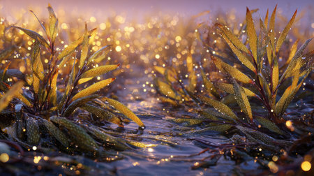 A panoramic wide view of Seaweed field growing closely together in a dewy morning shining droplets on leaves warm soft daylight ultra realistic photography cinematic wide composition lifelike natural scene