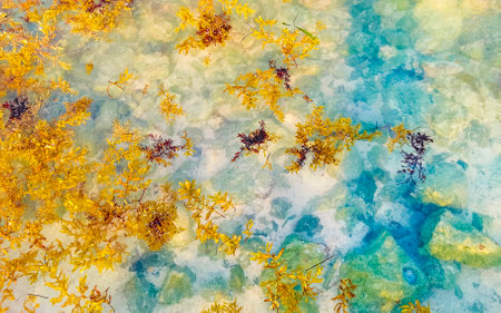 The beautiful Caribbean beach totally filthy and dirty the nasty seaweed sargazo problem in Playa del Carmen Quintana Roo Mexico.