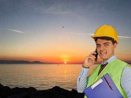 Young engineer with helmet and clipboard, speaking on mobile phone