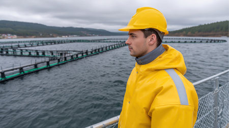 A young male worker in a bright yellow raincoat and hat stands by a tranquil aquaculture farm, gazing thoughtfully at the fish pens in the calm water.