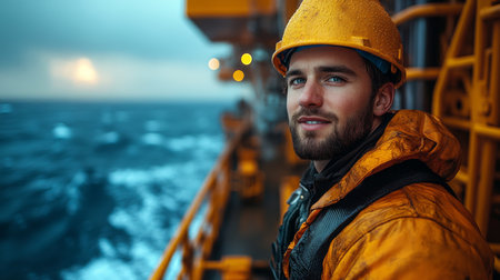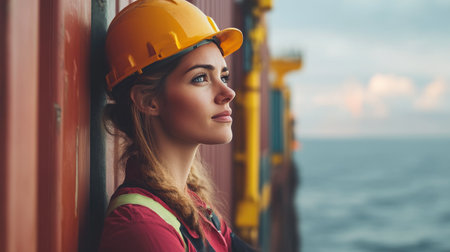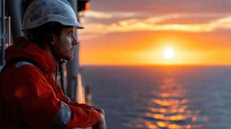 A lone worker wearing a safety helmet stands on a ship deck, gazing at the ocean waves. This scene highlights maritime safety and reflects a powerful connection with the open sea.