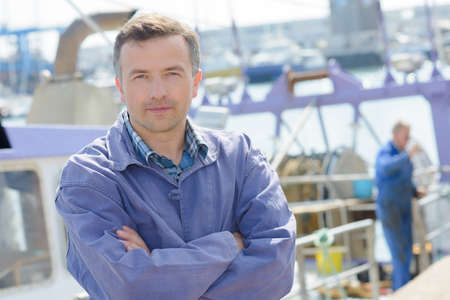A middle-agad man, a sea port worker, against the backdrop of ships. Fictional Person, Generative AI.