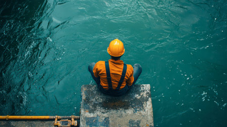 A worker in an orange shirt and hard hat sits on a concrete ledge, with legs dangling over the calm water below. The serene setting reflects a moment of thoughtfulness during a busy day.
