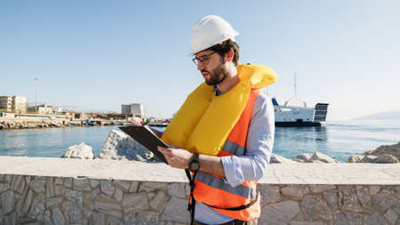 A Caucasian man is using a tablet to check goods on a container ship sailing at sea.