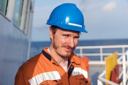 Seaman AB or Bosun on deck of vessel or ship , wearing PPE