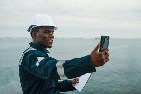 Bosun or seaman officer is taking selfie on the mobile cell phone
