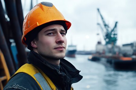 A vigilant construction professional gazes over a bustling harbor scene bathed in twilight, with rain-slicked surfaces reflecting vibrant industrial a