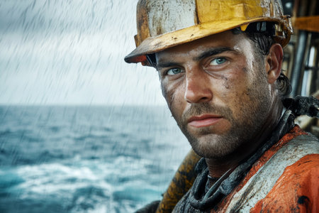 A contemplative man wearing an orange hard hat stands at the edge of a vessel, facing a turbulent sea against a backdrop of dark, ominous clouds. This image embodies resilience and determination in the maritime field.
