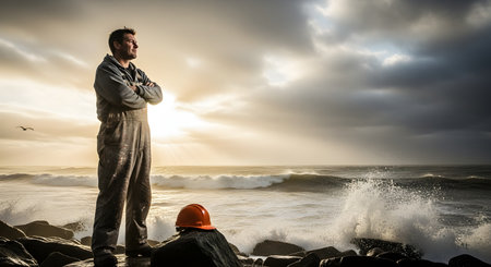 A strong worker in overalls stands proudly on seaside rocks with arms crossed, facing a rough ocean under a dramatic sky with sunlight breaking through. His orange hard hat rests nearby, symbolizing resilience, strength, and the spirit of a manual laborer.