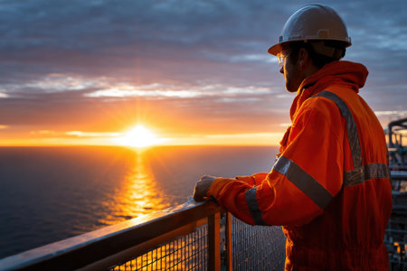 A worker in an orange jumpsuit stands on an offshore oil platform deck, looking out at the sunset over the ocean.