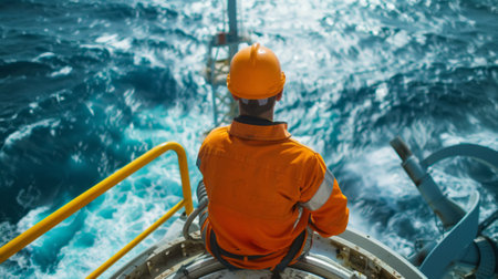 Safety-clad Oil Worker on Offshore Rig Extracting Oil from the Sea. Concept Offshore Oil Rig, Oil Extraction, Safety Equipment, Industrial Worker, Marine Environment,