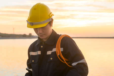 Young offshore rig worker in reflective vest leaning on coiled cable at sunset over calm ocean, representing life of an ocean platform technician, deckhand, or marine engineer.