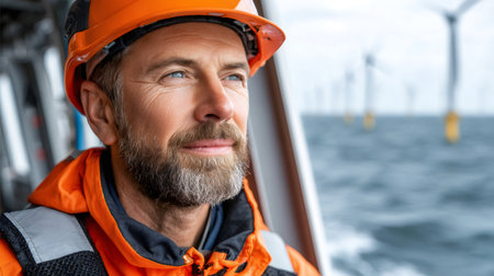 Portrait of an engineer wearing an orange hard hat and high visibility jacket, observing offshore wind turbines from a boat, representing renewable energy development