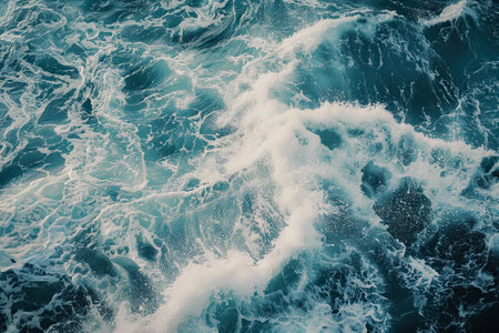Overhead shot capturing a vivid teal ocean surface. Dynamic wave surges across, creating white foam patterns contrasting against the deep blue of the water below.
