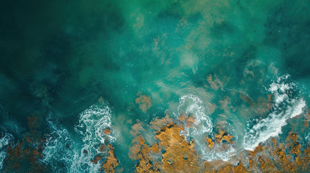 An aerial perspective of gentle sea waves washing over coastal reefs, highlighting the intricate dance between water and earth.