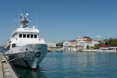 Sevastopol, Crimea - September 29, 2020: Ship near Sevastopol city dock with people, Illustrative Editorial.