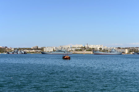 SEVASTOPOL, RUSSIA - MAY 09, 2015:Sevastopol bay. A city in South-West of the Crimean Peninsula on the Black sea coast. Ice-free sea trade port, industrial, cultural and historical center