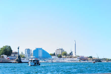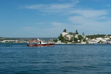 CRIMEA, SEVASTOPOL, AUGUST 24, 2014: Passenger boat plying in the Sevastopol Bay. View of the bay of Sevastopol from the sea.