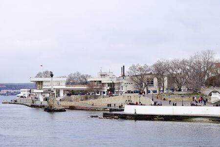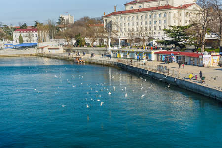 Sevastopol, Crimea - March 14, 2021: View of embankment of Sevastopol at the Artillery bay in spring.