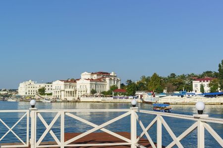 Russia, Crimea, Sevastopol - September 03.2017: the railing of the pier for boats and ferries in the Artillery Bay. The white architecture of the seaside town