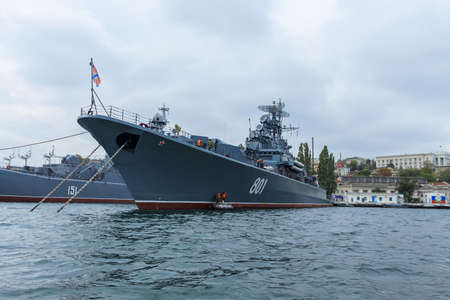 SEVASTOPOL, CRIMEA - AUGUST 24, 2016: Soviet and Russian Black Sea Fleet warships, standing in the quay of the Sevastopol bay, Crimea
