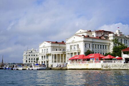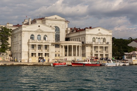 A view of the Russian Drama Theater named after Lunacharsky from Sevastopol Bay. There are pleasure boats on the water, people walk along the embankment. Crimea Peninsula, July 25, 2015
