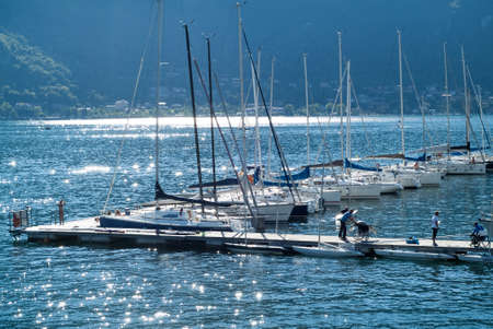 Abbadia Lariana, Italy - September 6th, 2015: people sunbathing on a pier full of boats at Lake Como, Lombardy, Italy.